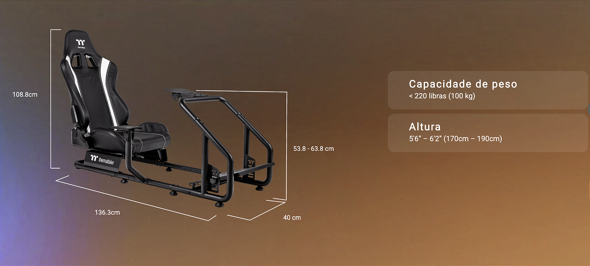 O Cockpit GR300 Racing Simulator é construído com uma estrutura de aço durável para máxima estabilidade, ele possui um assento de corrida ajustável em PVC e suportes para pedais que se adaptam perfeitamente à sua posição de pilotagem. O cockpit também inclui pontos de montagem pré-perfurados, garantindo ampla compatibilidade com grandes marcas como Thermaltake, Logitech, Fanatec, Thrustmaster e outras. Seja para pilotagem casual ou corridas competitivas, o GR300 oferece conforto, realismo e adaptabilidade para cada sessão.