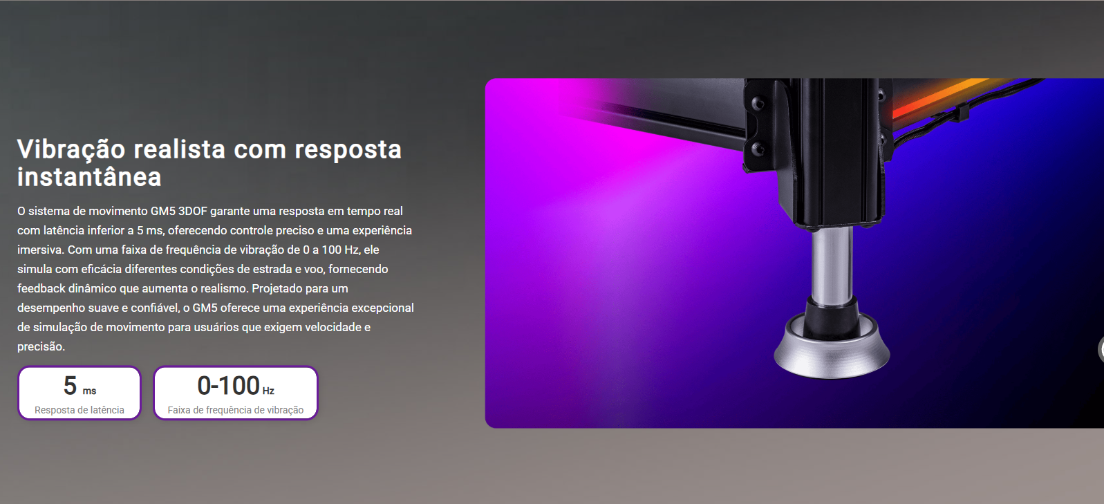 Com latência inferior a 5 ms, você desfrutará de respostas em tempo real, enquanto a faixa de vibração de 0 a 100 Hz simula diversas condições de estrada e voo. Além disso, o GM5 é totalmente compatível com a maioria dos jogos e recebe atualizações contínuas através do SimTools para a melhor experiência possível.